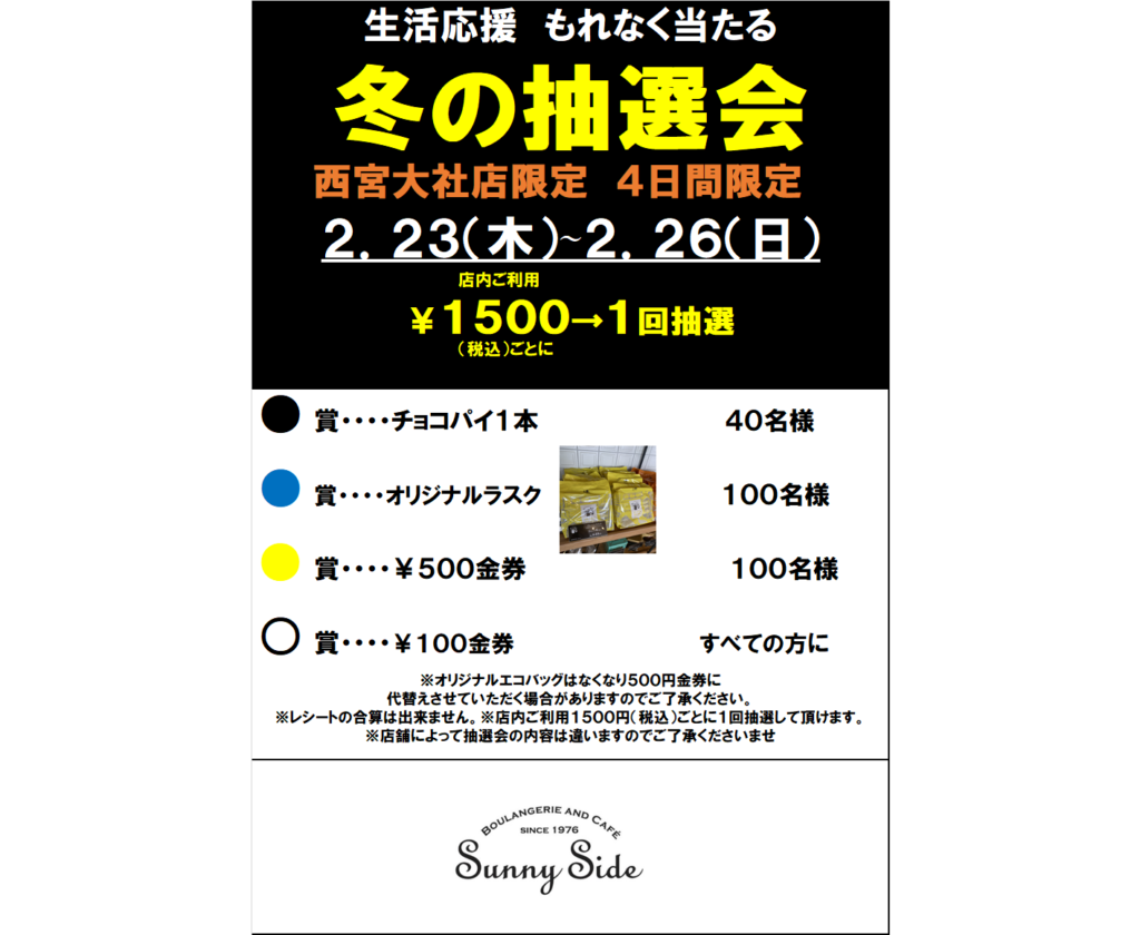 2/23~26の4日間 冬の店舗別大抽選会! 14 2月 2023 sunnyside-staff News & Topics ※誠に恐れ入りますが<枚方長尾店>は開催しておりません! <南千里本店> <箕面小野原店> <吹田佐井寺店> <高槻岡本店> <宝塚中山寺店> <西宮大社店> <みのおキューズモール店> <夙川グリーンプレイス店>