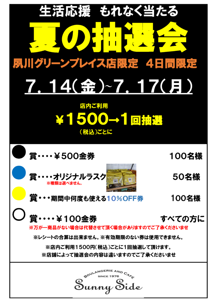 生活応援! もれなく当たる夏の抽選会! 7 7月 2023 sunnyside-staff News & Topics サニーサイド各店にて開催いたします。是非ご利用ください。※実施内容・条件等、各店舗ごとに違います。