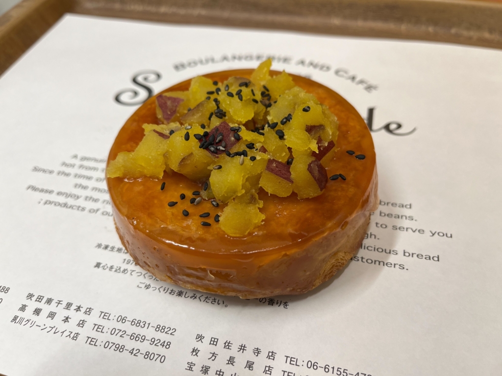 ほんのり甘い焼き芋のペーストをクイニーアマンに包み焼き上げ、さつまいもの甘露煮を上に乗せ仕上げました。
