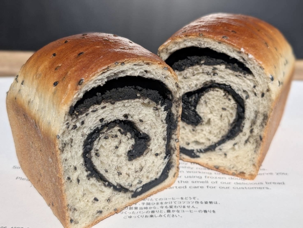 食パン生地に黒ごまを練り込み、黒ごまあんを包んで焼き上げました。