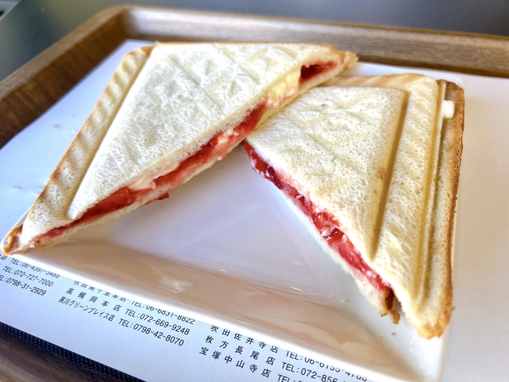 ツブツブ食感の苺クリームとジャムをぬり、刻んだイチゴを乗せて、アクセントにクリームチーズを入れました。