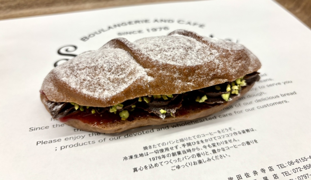 ココアを練り込んだ食パン生地に果肉たっぷりのいちごフィリングとヘーゼルナッツチョコをサンドし、ピスタチオをトッピングしました。