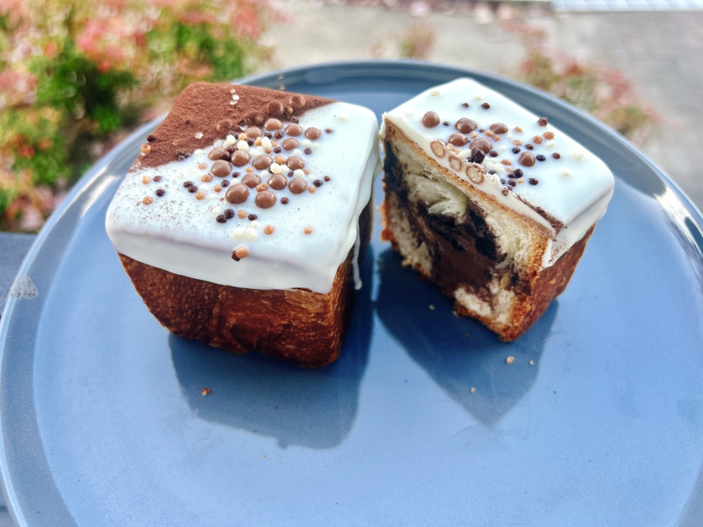 デニッシュ生地にクランチチョコを混ぜたミルクチョコクリームを絞り、ホワイトチョコをかけました。