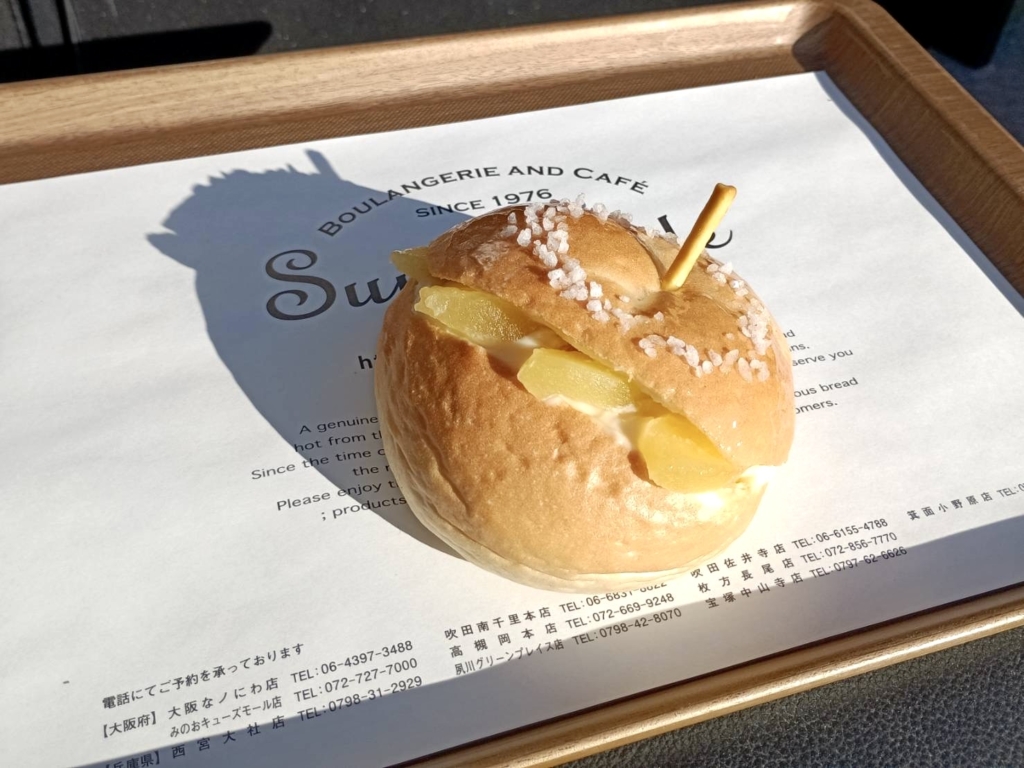 ベーグル生地にカスタードとりんごを入れ、りんごクリームをたっぷり挟んだベーグルです。