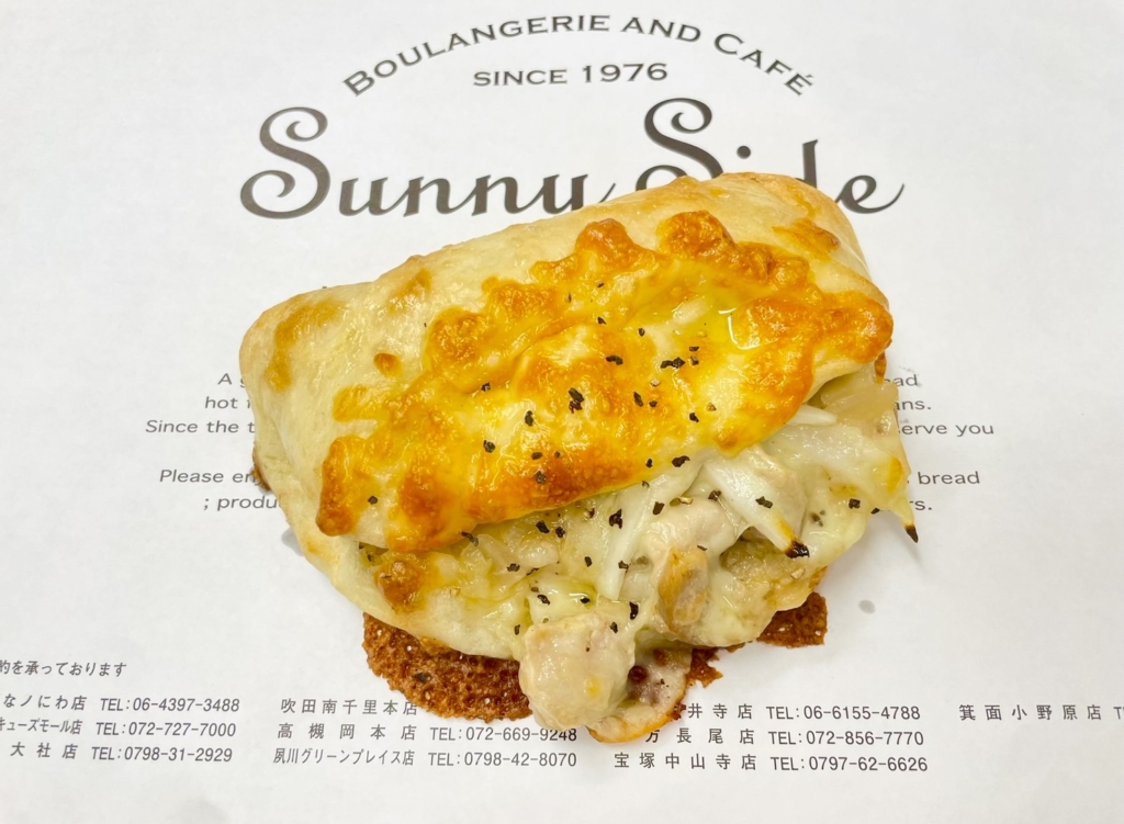 食パン生地に旨塩キャベツ、チキン、玉ねぎをはさみ、チーズをかけて焼き上げました。