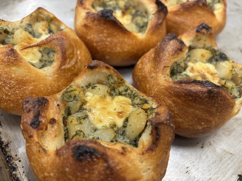 伊勢志摩特産の糸青のりをフランス生地に練り込み、青のりポテトサラダを包み、マヨネーズを絞って焼き上げました。