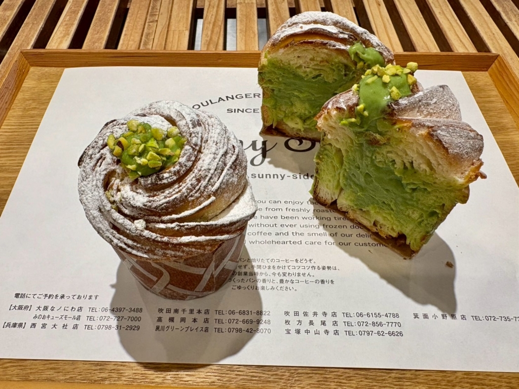 外はサクサク、中はしっとりとした食感のクロワッサン×マフィンにピスタチオクリームをたっぷりと絞りました。