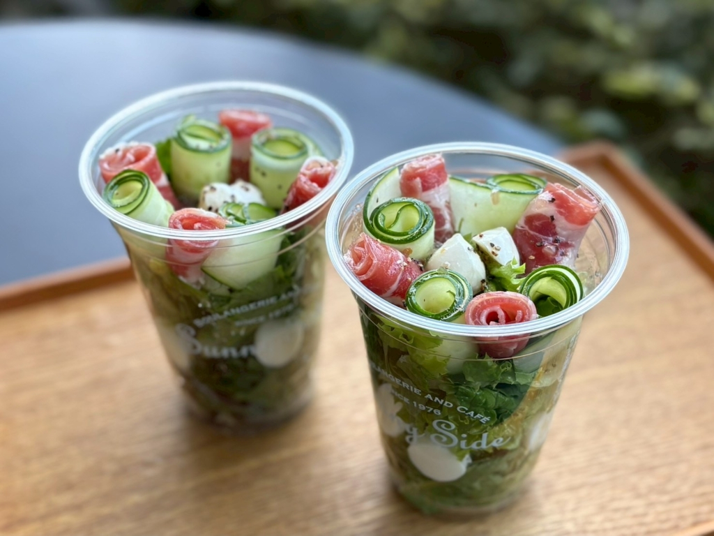 生ハム、モッツアレラ、きゅうり、グリーンリーフ、ベビーリーフを使ったブーケ風サラダです。イタリアンドレッシングでお召し上がりください。