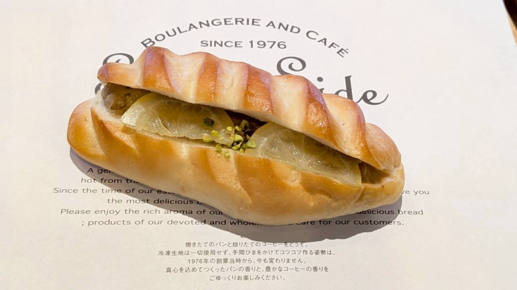 紅茶のクリームとセミドライレモンをあわせたクリームを、国産小麦を使用したもちもちとしたパンにしぼり、レモンのシロップ漬けとピスタチオをのせレモンティー風に仕上げました。