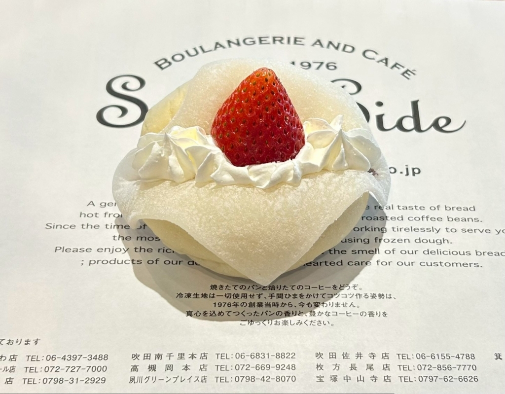 もちもちした食パン生地に、求肥、つぶあん、ホイップをはさみ苺を乗せて仕上げました。