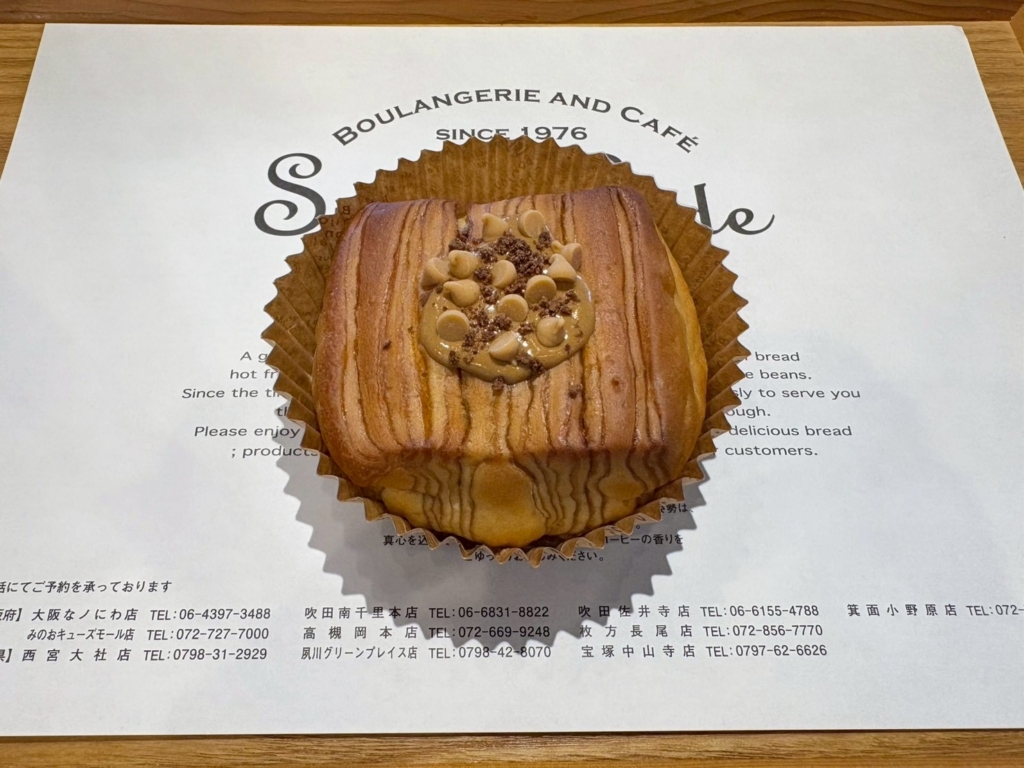 ふんわりした生地にキャラメルシートを折り込んでアクセントにコーヒーアイシングをのせました。