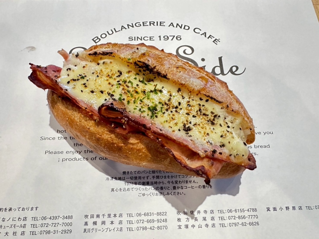 フランスパンにベーコンとジャーマンポテトをはさみブラックペッパーで仕上げました。