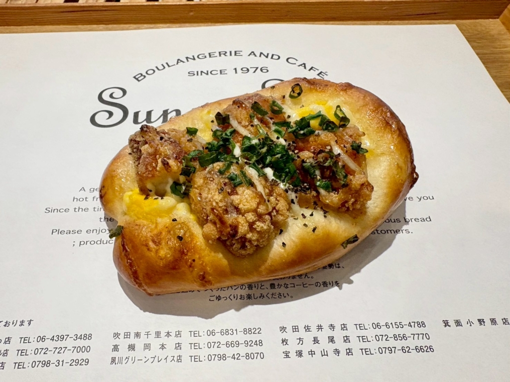 ふんわり柔らかいパンに自家製たまごサラダ、竜田揚げ、マヨネーズ、ネギ、をのせ焼き上げ、ブラックペッパーをかけ仕上げました。
