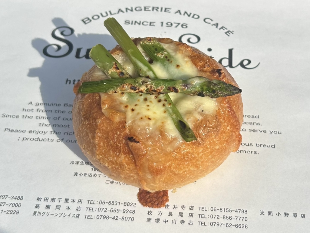 フランス生地にシチューを流し込み、炭火焼きの豚タンとアスパラ、チーズを乗せ、炙って仕上げしました。