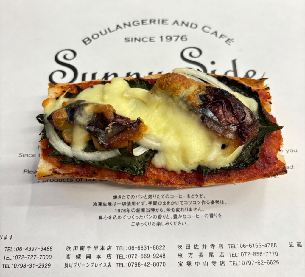 フランス生地にイタリアントマトソースをぬり塩サバと大葉と玉ねぎを乗せ、チーズをトッピングしました。