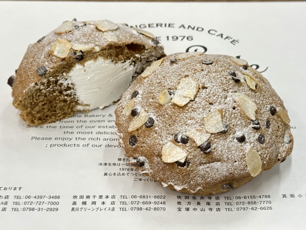 コーヒー粉末を練り込んだ菓子生地にクッキー生地を絞り、チョコチップとアーモンドスライスを乗せて焼き上げたパンに、ホイップを絞って仕上げました。