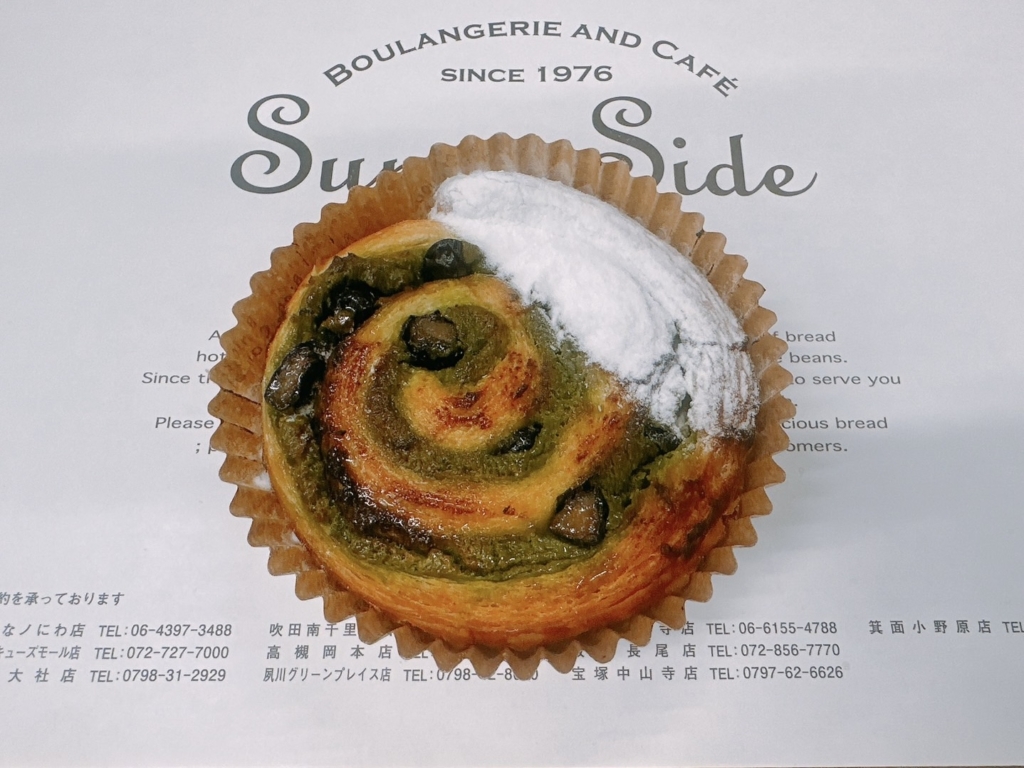 丹波の黒豆と抹茶クリームをデニッシュ生地で巻いて焼き上げました。