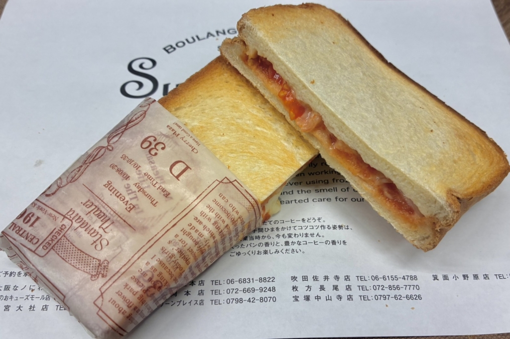 ケチャップを塗り広げた食パンにトマト、ベーコン、チーズを挟んでさらに表面がカリッとなるまで焼き上げました。