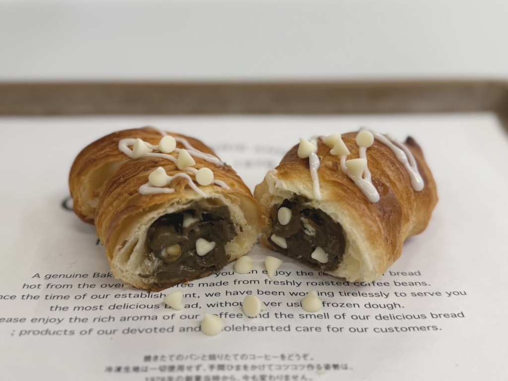自家製の濃厚なほうじ茶クリームにホワイトチョコチップを混ぜ込み、サクサクのクローネにたっぷり絞りました。