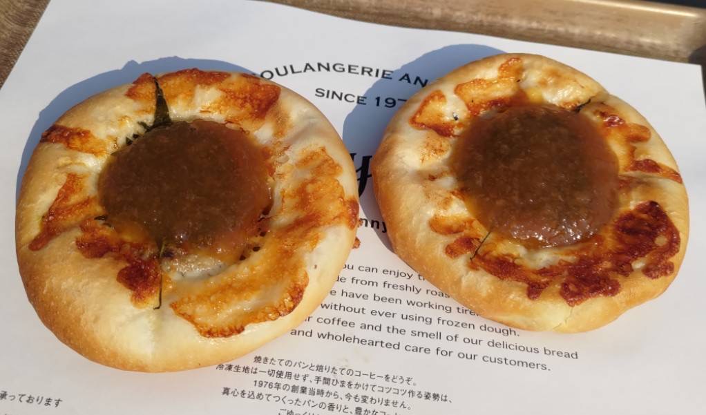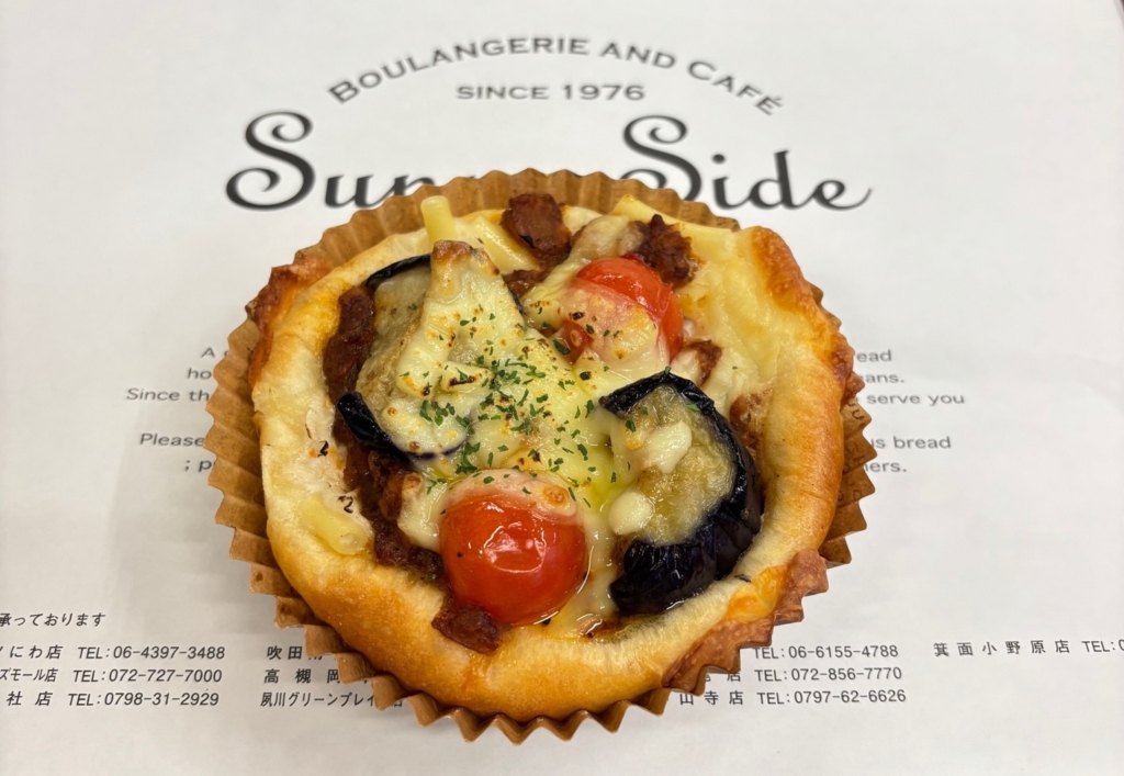 ロール生地にマカロニサラダとボロネーゼを入れ、なす、ミニトマト、チーズをトッピングしました。