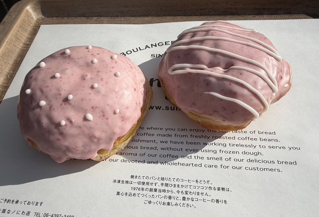 ドーナツ生地に自家製クリームをしぼって、パリパリ食感の苺チョコをコーティングしました。