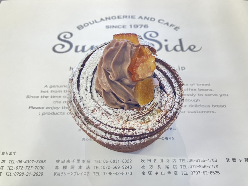 チョコクロ生地にオレンジピールを入れ焼き上げ、仕上げにショコラクリームを絞り粉糖とオレンジピールをのせました。