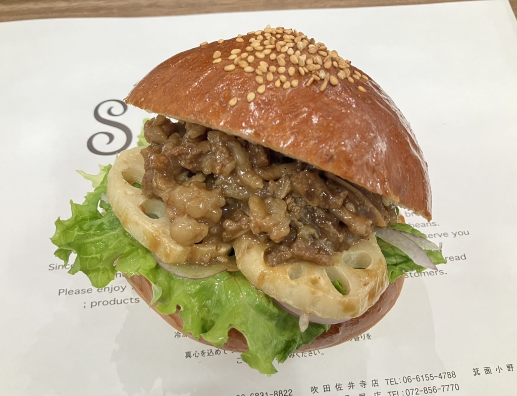 バンズにマヨ、グリーンリーフ、アーリーレッドをのせ素揚げしたれんこんと炭火焼き牛カルビをサンドしました。