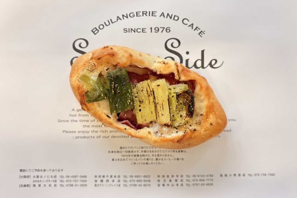 フランス生地に豚タンを包餡し上にニンニク漬けの長ネギをのせ焼き上げ、オリーブ、ペーパーで仕上げました。