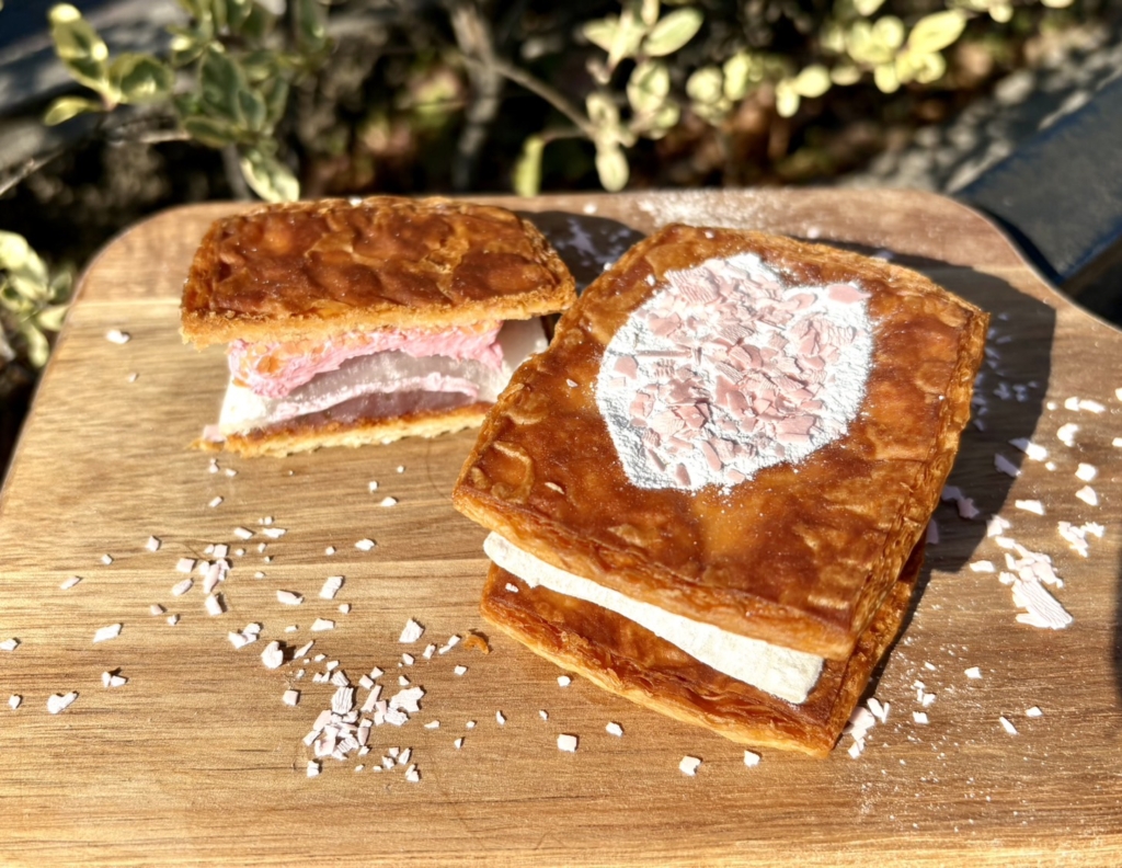 デニッシュ生地をサクッと焼き上げ、桜あん、ぎゅうひ、桜ホイップをサンドしました。