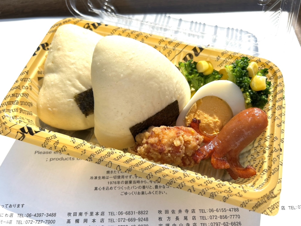 てりやきチキンを挟んだおむすびパンが入ったピクニックにぴったりのセットです。