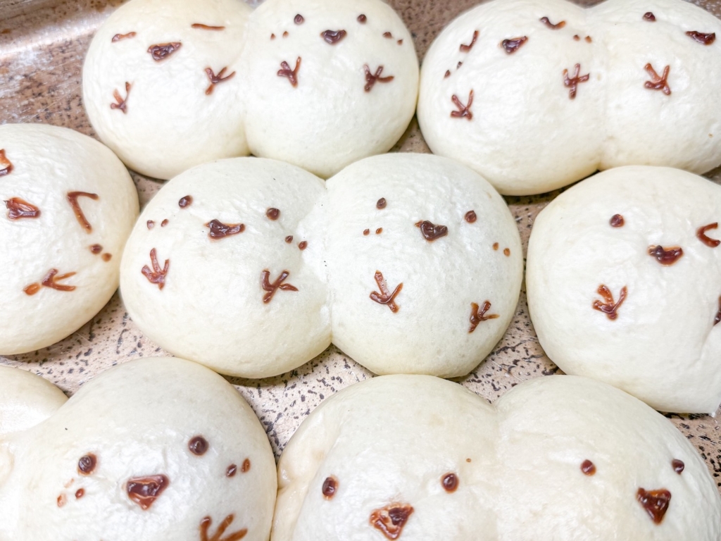 ふんわり生地に、シマエナガの表情を書きました。1羽には自家製カレー、もう1羽にはホワイトソースを包み込んで焼き上げました。見た目も味も楽しめるひと品になってます! ebi
