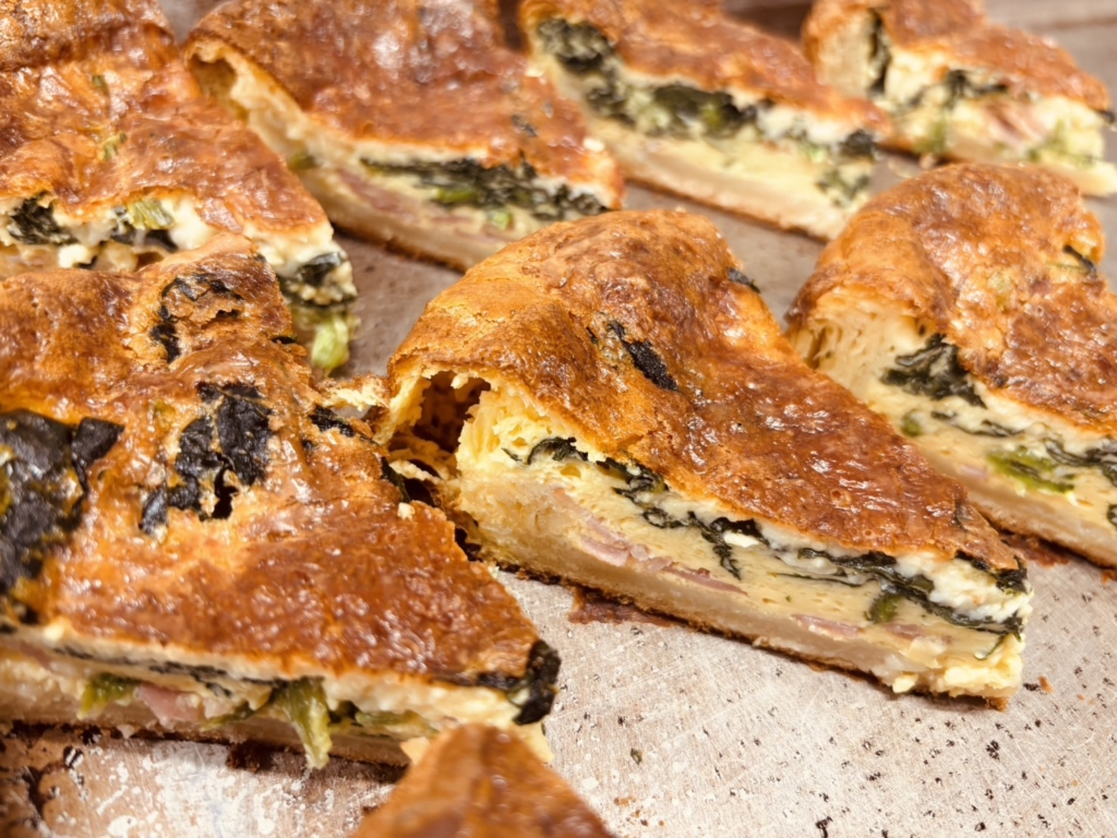旨みのあるベーコンとほうれん草をなめらかな卵生地で焼き上げました。サクッとした生地とやさしい味わいが楽しめます。 hata