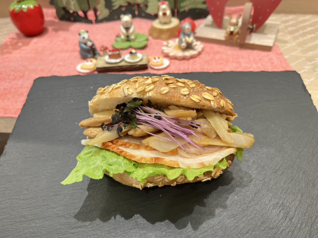 タケノコとゴボウ、白だしできのこを和えてローストチキンと一緒にサンドしました。
