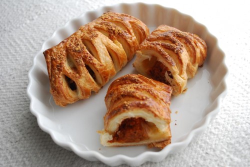 ⑤ミートパイ・・・210円 クロワッサン生地でボロネーゼフィリングとチーズを包み、エダムチーズをトッピングして焼き上げました。