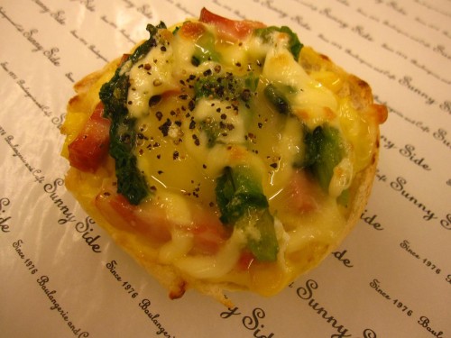 ③菜の花とコーンポタージュのタルティーヌ・・・210円 ベーグルにコーンポタージュスープ、菜の花、ベーコン、マヨネーズ、モッツァレラチーズをのせ焼き上げました。