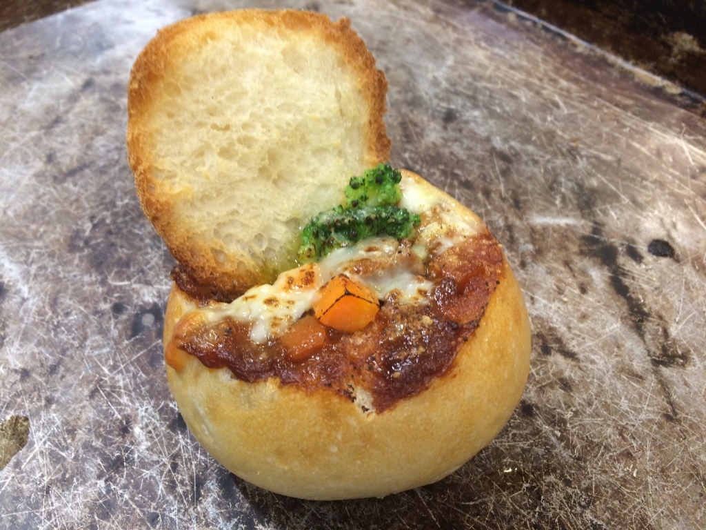フランスパンのうつわに、ビーフシチュー、牛肉、ブロッコリー、にんじんを盛り込み、