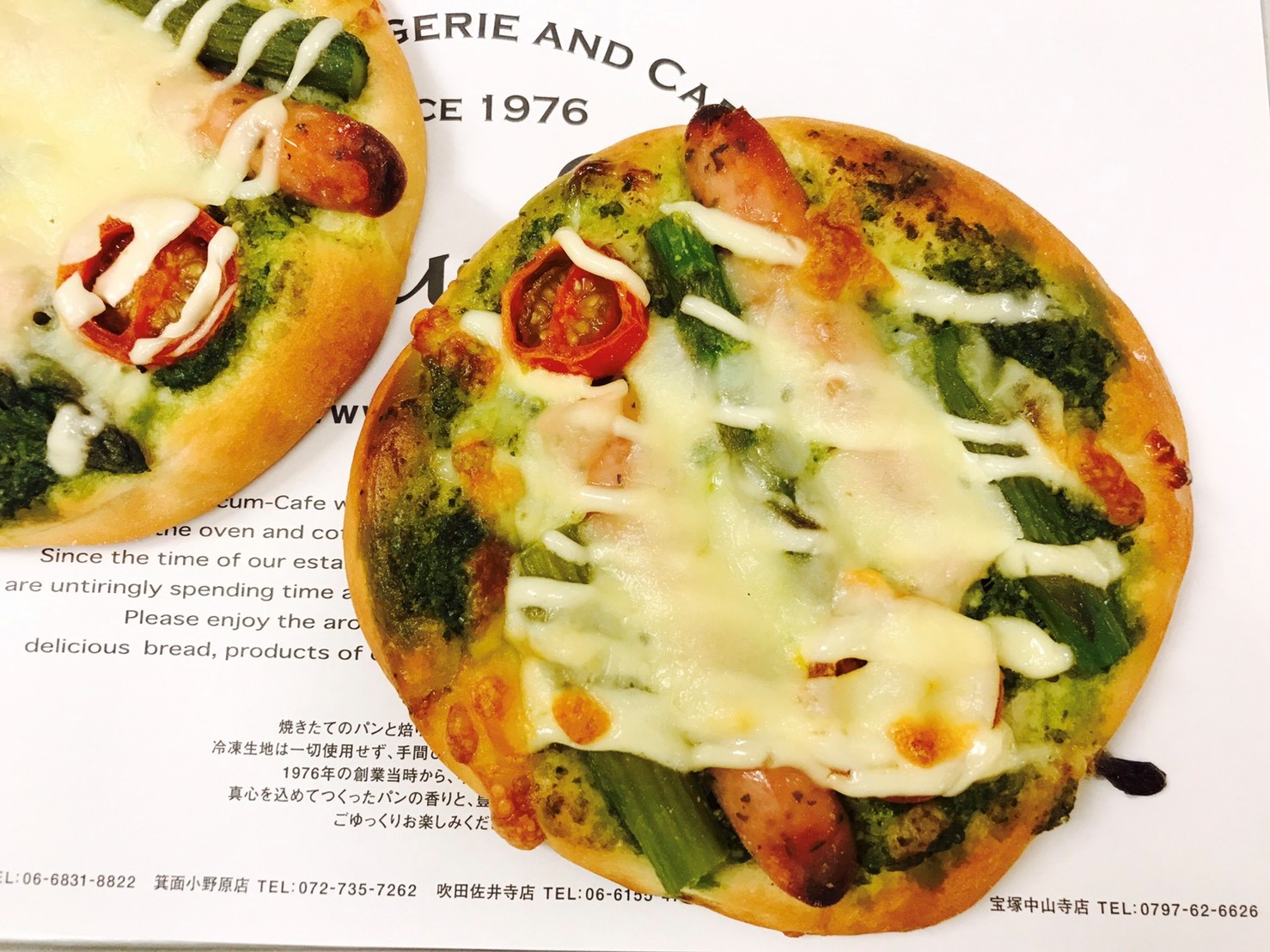 ¥190(205)ジェノベーゼソースの爽やかなピザに、パンチの効いたガーリックウインナーと歯ごたえの良いアスパラを乗せた、食べ応えのあるピザです。