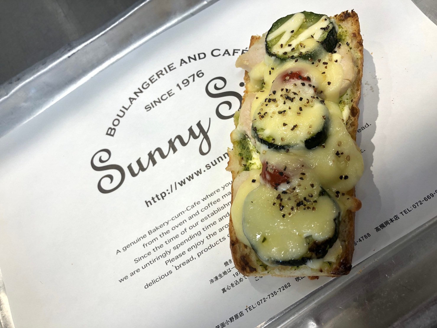 バケットにカマンベールチーズ、バジルペーストを塗り、蒸し鶏、ズッキーニ、プチトマトをトッピングして焼き上げました。