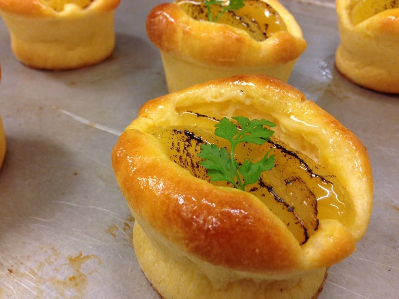 ブリオッシュ生地に自家製りんごのクリームチーズを絞りバーナーであぶったリンゴをのせて焼き上げました。