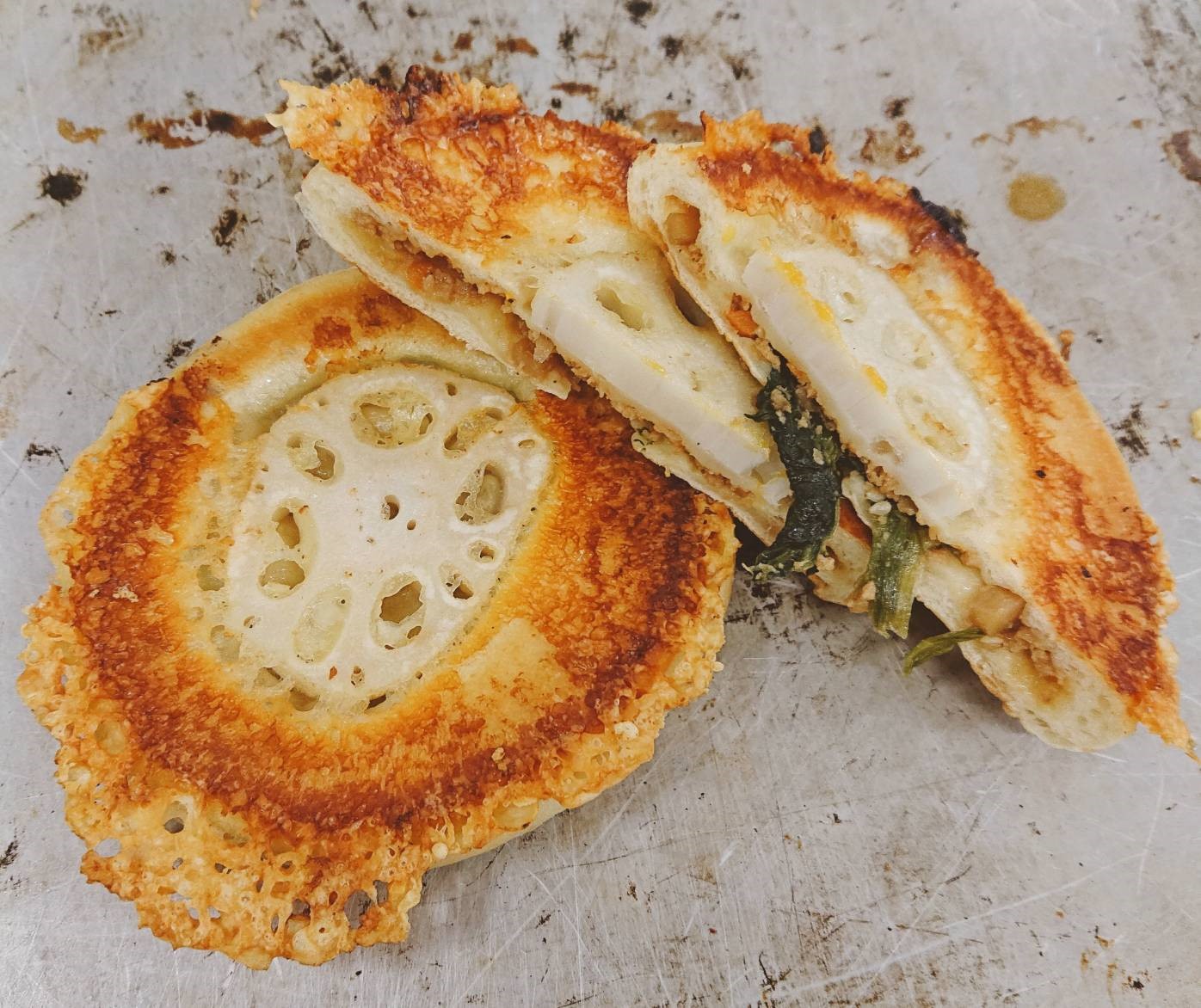 そぼろとほうれん草を和えたものをロール生地で包み、れんこんとチーズをカリカリに焼き上げおやきにしました。