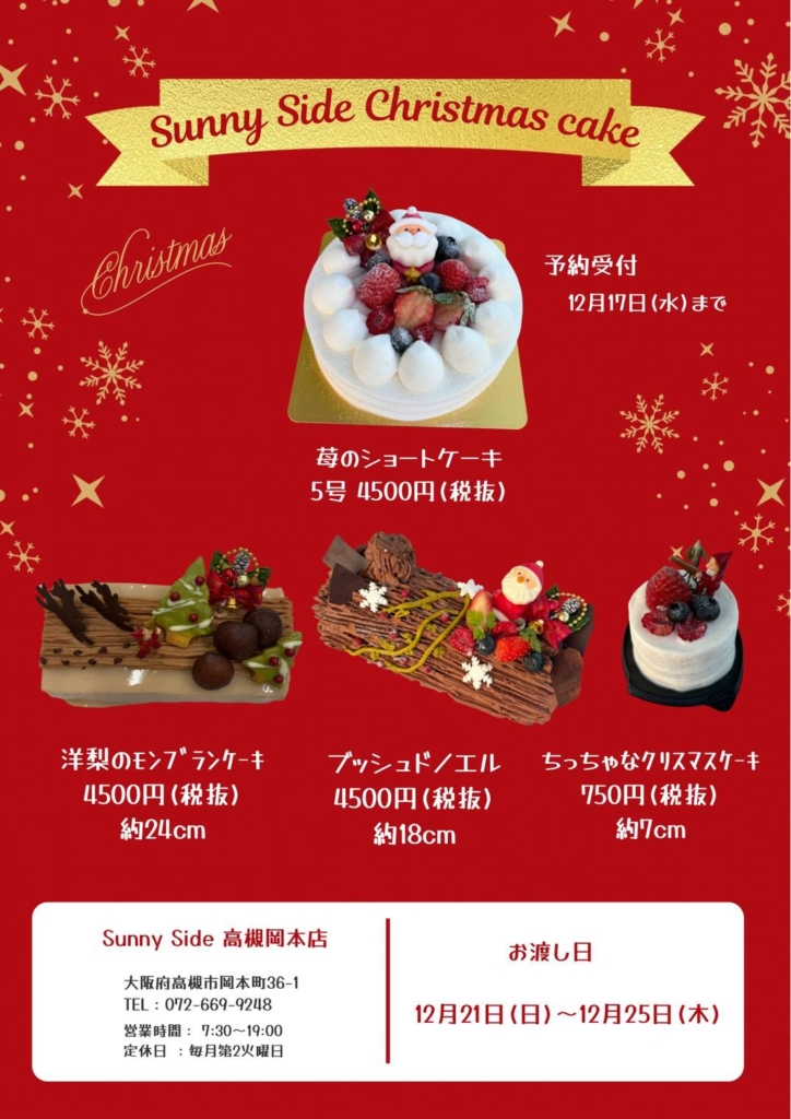【高槻岡本店・限定販売】クリスマスケーキご予約受付中 30 11月 2025 sunnyside-staff 高槻岡本店NEWS サニーサイドのクリスマスケーキ 高槻岡本店限定です。予約受付:2025年12月17日までお渡し日:12月21日(日)から25日(木)