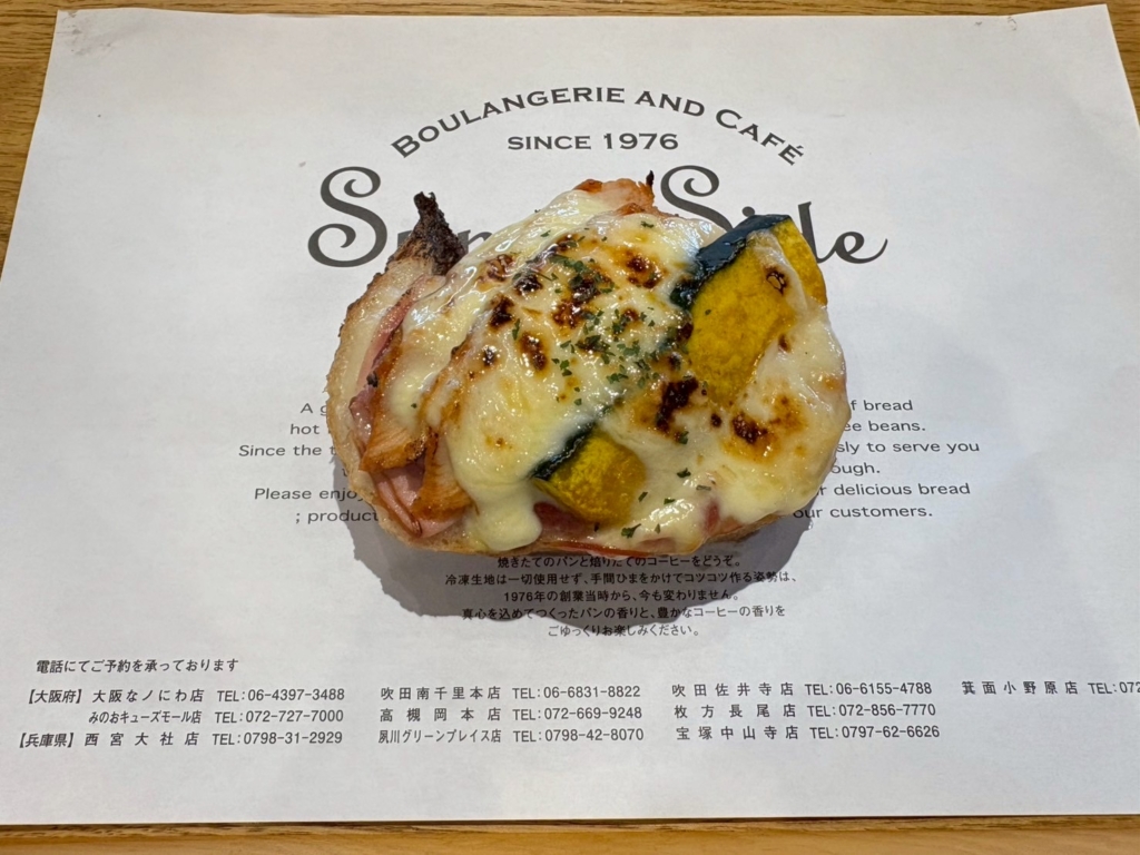 全粒粉のフランスパンにショルダーハム、ホワイトソース、タンドリーチキン、カボチャ、チーズをのせて焼き上げました。