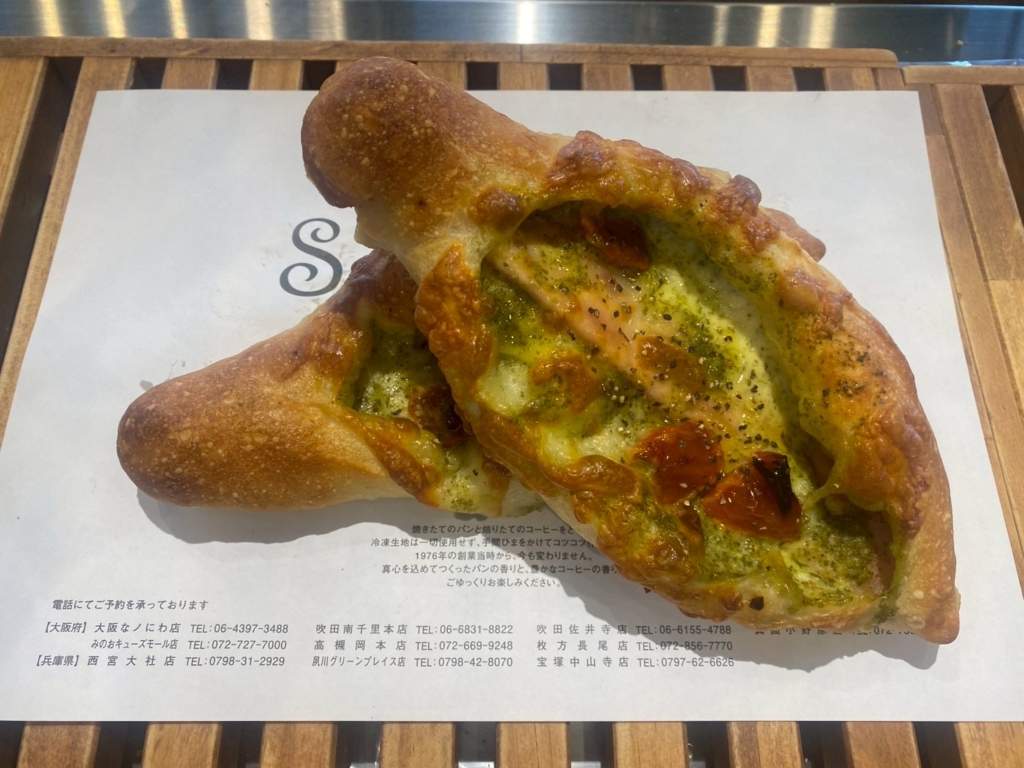 フランス生地にバジルペースト、ベーコンを包み、チーズとセミドライトマトをのせ焼き上げました。