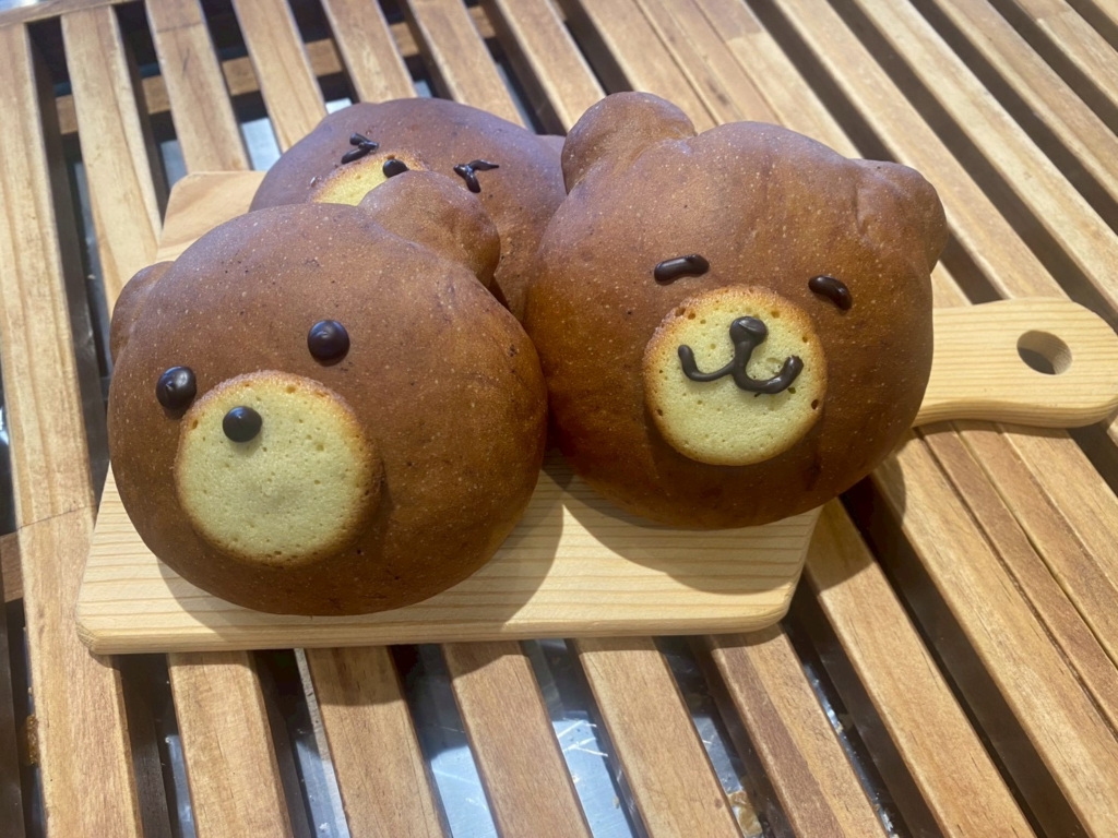 ココアを練り込んだ生地にチョコチップと自家製カスタード包み、くまさんの形に焼き上げました。
