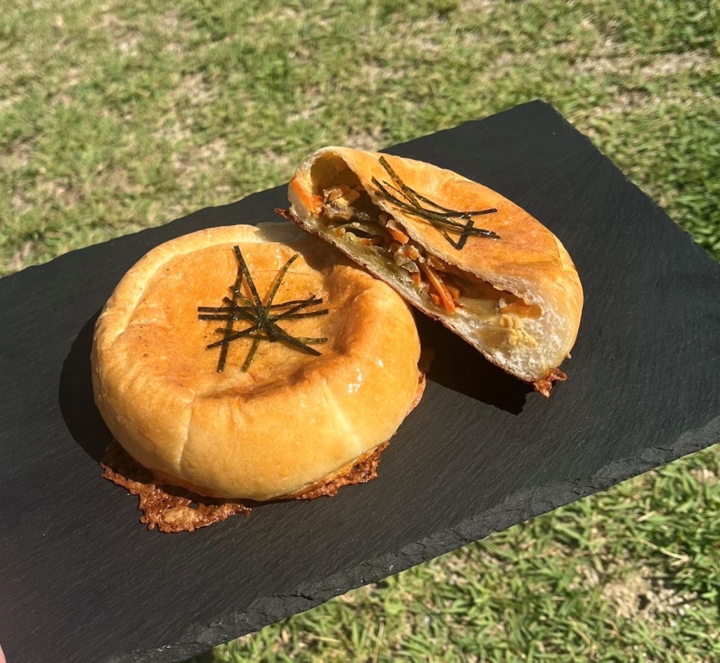 食パン生地にきんぴらごぼうとラー油マヨを包み、下のチーズをカリカリに焼き上げおやき風にしました。