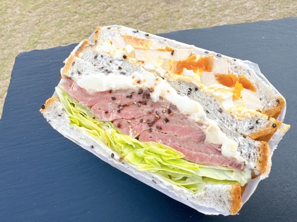 ローストビーフを自家製のタレに漬け込んだサンドと煮卵とタマゴサラダを合わせたサンドです。