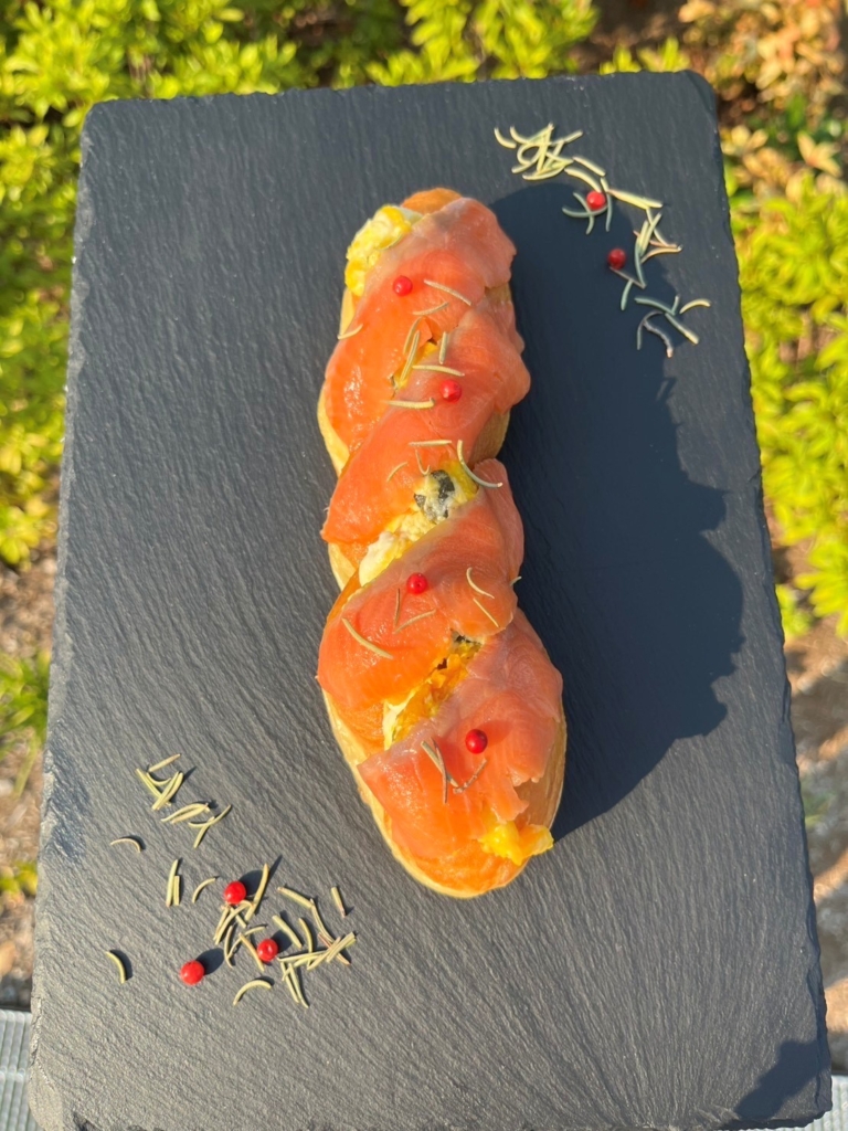 かぼちゃサラダの上にスモークサーモンをのせたシンプルなドーナツです。