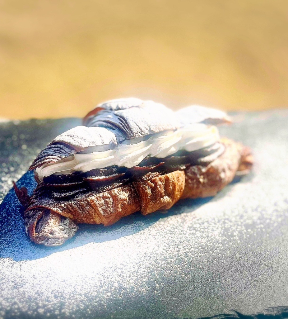 チョコクロワッサンに、チョコカスタードとホイップクリームを挟んだデザートパンです。
