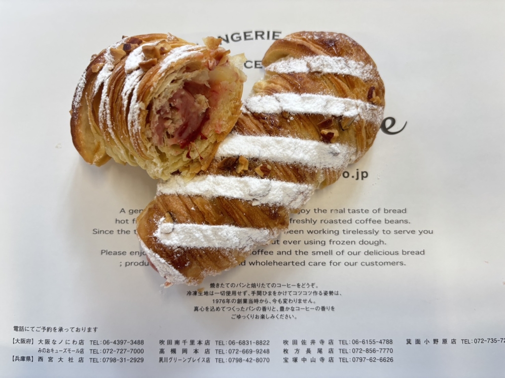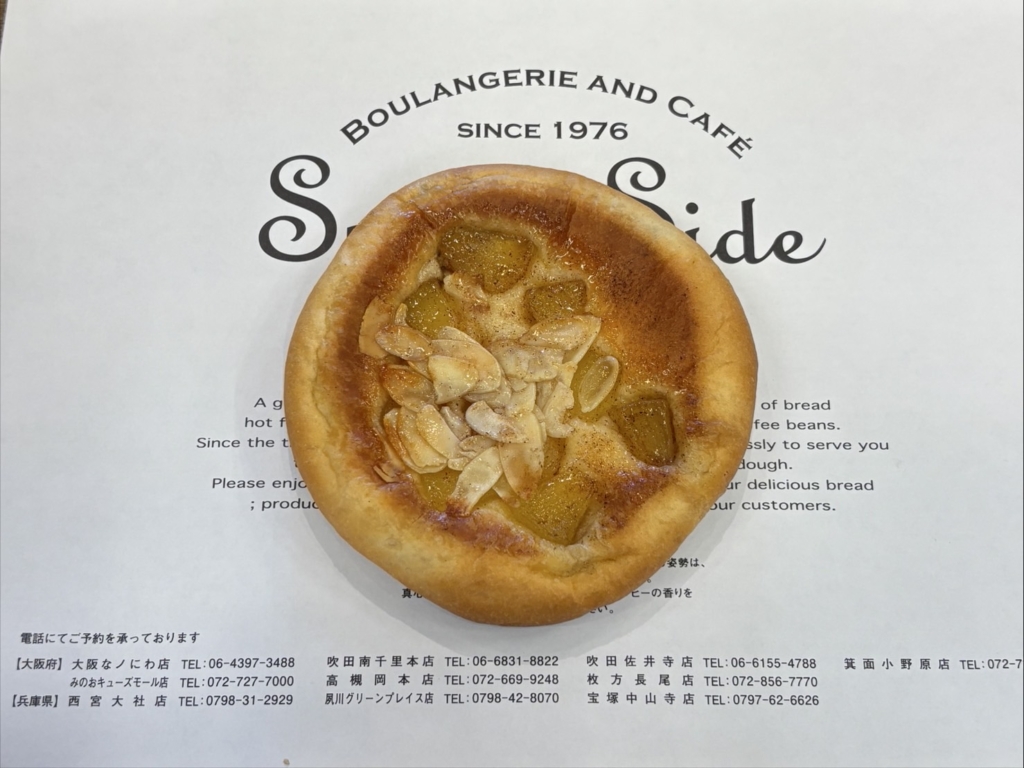 菓子パン生地にリンゴ味のクリーム、キャラメルソースを包み上にリンゴとアーモンドスライス、アップルパイ風味のバターフィリングをのせて焼き上げました。