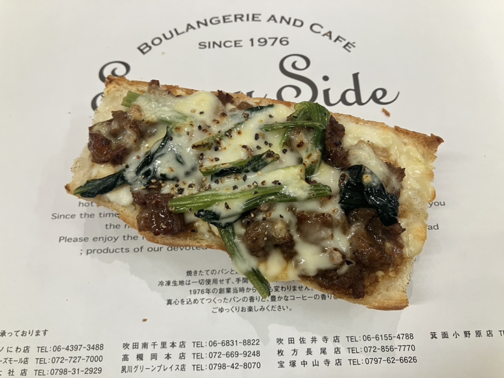 タルティーヌにクリームチーズをぬり、牛カルビとほうれん草、チーズをのせ焼き上げました。